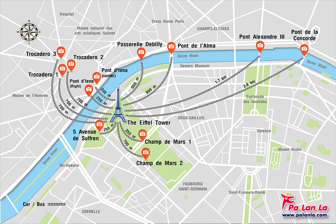 สำหรับใครที่ต้องการมุมโล่งๆ ของสะพาน Pont d’lena คู่กับหอไอเฟล ก็สามารถย้ายมาถ่ายภาพที่ตรงกลางสะพาน เลือกถ่ายภาพแสงไฟของรถยนต์ที่พุ่งตรงไปยังหอไอเฟลในยามค่ำคืนได้เช่นกัน แต่เนื่องจากพื้นที่ที่ค่อนข้างแคบ จึงต้องใช้เลนส์มุมกว้างที่มีระยะตั้งแต่ 14 mm. ขึ้นไป และนอกจากการเดินหามุมถ่ายภาพบริเวณสะพานแล้ว เรายังสามารถเดินลงไปที่บริเวณทางเดินเลียบแม่น้ำแซน เพื่อหามุมสวยๆ เพิ่มเติมได้อีกด้วย