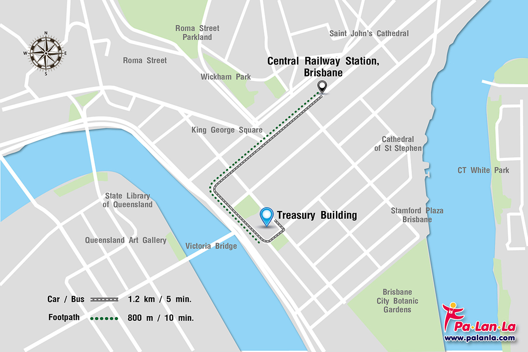 - เดิน (Footpath) จาก Central Station นักท่องเที่ยวสามารถเดินไป Treasury Building ได้โดยเดินไปตามถนน Ann St มีระยะทาง 800 เมตร ใช้เวลาประมาณ 10 นาที