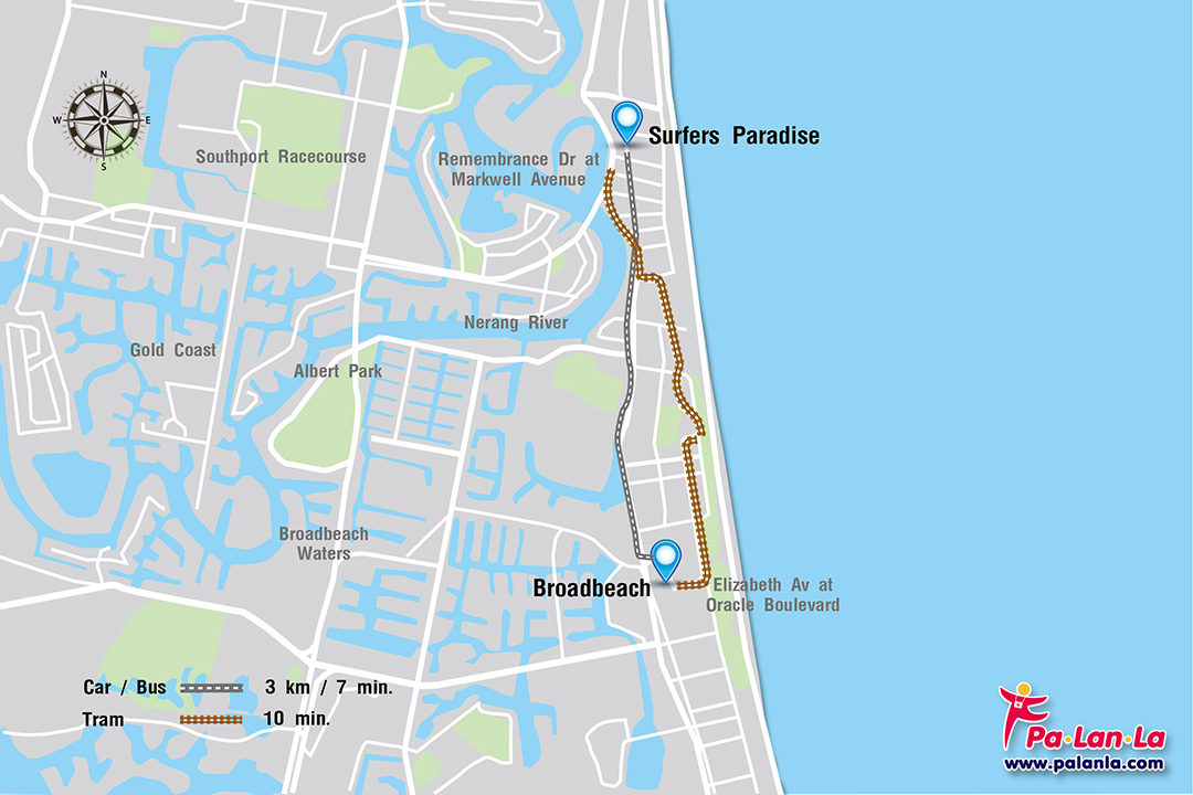 - รถราง GLink (Tram) ขึ้นรถรางจาก Surfers Paradise ไปลงที่ป้าย Broadbeach North ใช้เวลาเดินทางประมาณ 10 นาที