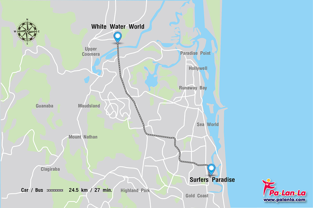 - รถยนต์ (Car) การเดินทางโดยรถยนต์จาก Surfers Paradise ไปยัง White Water World มีระยะทาง 24.5 กิโลเมตร ใช้เวลาเดินทางประมาณ 27 นาที