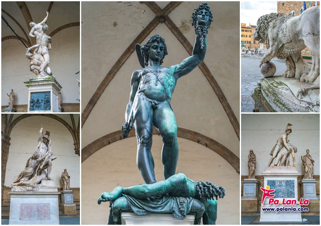 The Rape of the Sabine Women (ซ้ายบน), The Rape of Polyxena (ซ้ายล่าง), เพอร์ซิอุสผู้พิชิตเมดูซ่า (กลาง), สิงโตคู่ Medici Lion (ขวาบน), เมเนลอสอุ้มร่างของพาโทรคลุส (ขวาล่าง)