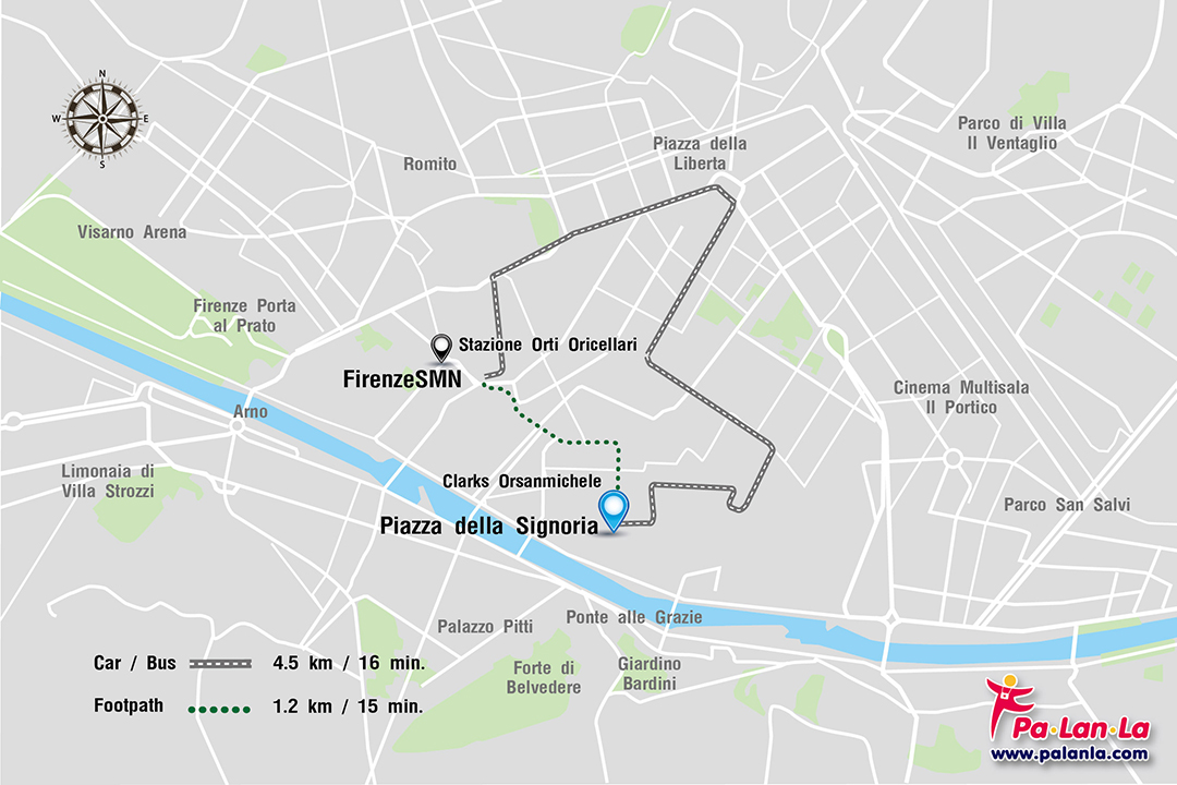 - การเดิน (Footpath) จากสถานีรถไฟกลาง Firenze SMN ไปยังจัตุรัส Piazza della Signoria ระยะทางประมาณ 1.2 กิโลเมตร ใช้เวลาประมาณ 15 นาที