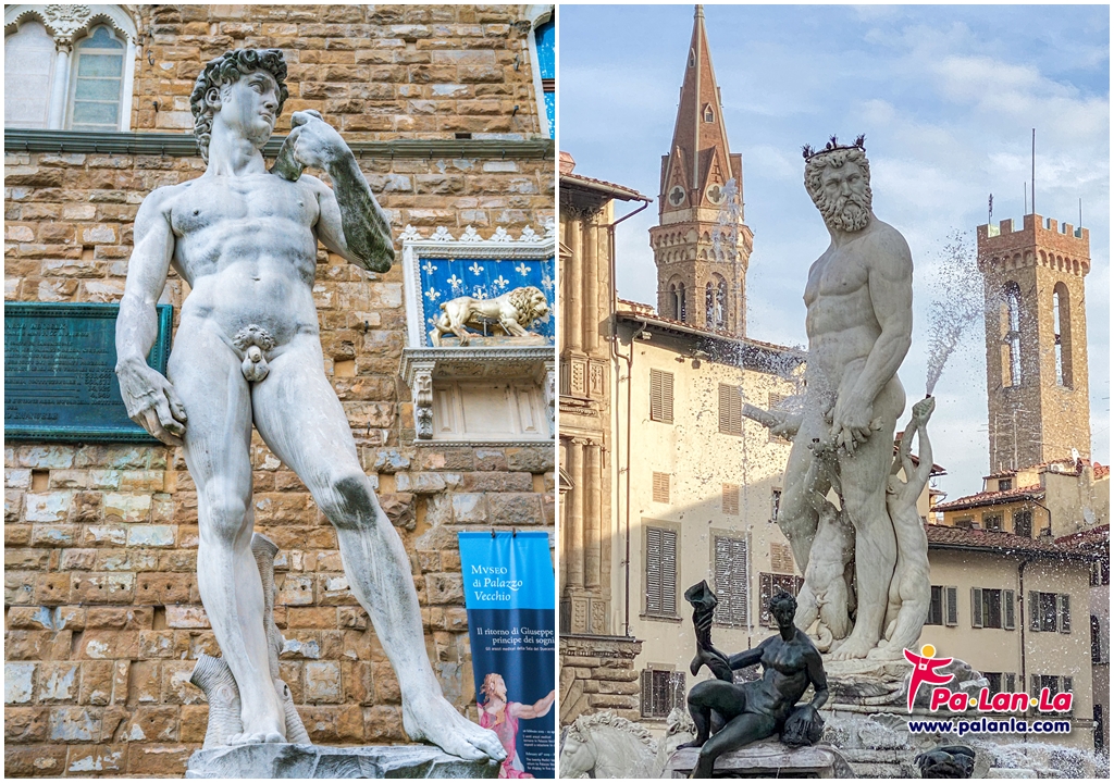 ชมสถาปัตยกรรมศิลปะยุคเรอนาสซองส์รอบจัตุรัส โดยจะมีหอคอยพระราชวัง Palazzo Vecchi เป็นจุดเด่น ชมรูปปั้นเดวิด (จำลอง) และรูปปั้นชื่อดังระดับโลกอีกมากมายที่อยู่ภายในหอศิลป์ Loggia dei Lanzi