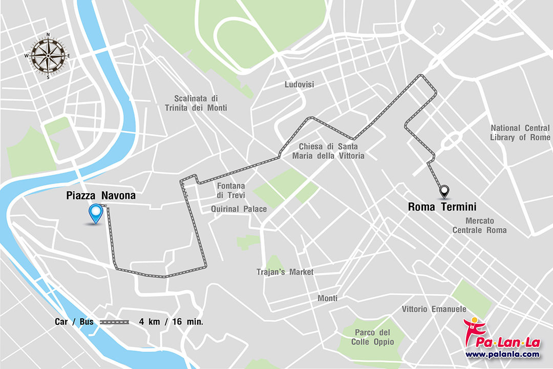 - รถยนต์ (Car) การเดินทางโดยรถยนต์จากสถานี Roma Termini ไปยัง Piazza Navona โดยใช้เส้นทางสาย Via Nazionale มีระยะทาง 4 กิโลเมตร ใช้เวลาเดินทางประมาณ 16 นาที