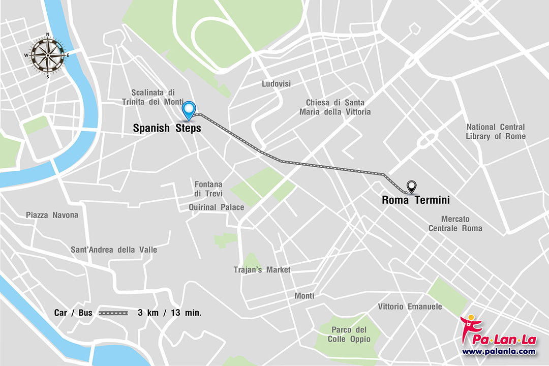 - รถยนต์ (Car) การเดินทางโดยรถยนต์จากสถานี Roma Termini ไปยัง Spanish Steps โดยใช้เส้นทางสาย Via Nazionale มีระยะทาง 3 กิโลเมตร ใช้เวลาเดินทางประมาณ 13 นาที