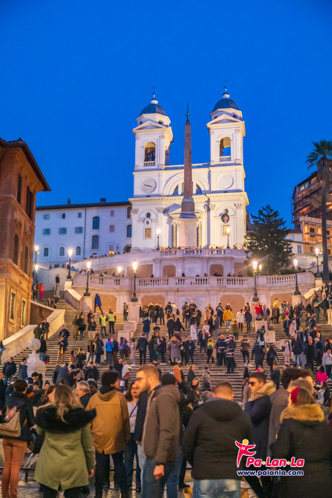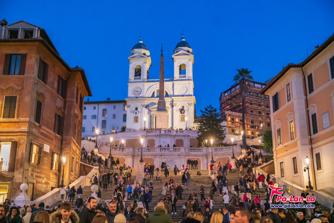 บันไดสเปนในยามค่ำบรรยากาศยังคงคึกคักและมีนักท่องเที่ยวเดินทางมาอย่างต่อเนื่อง