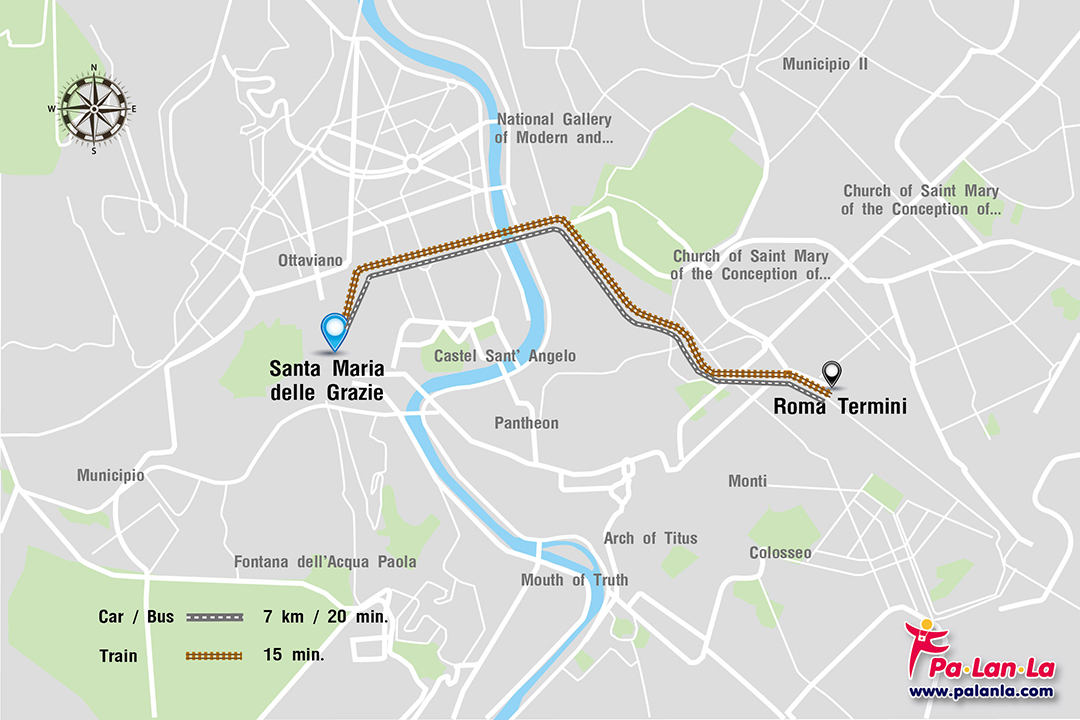 - รถยนต์ (Car) การเดินทางโดยรถยนต์จากสถานี Roma Termini ไปยัง Santa Maria delle Grazie โดยใช้เส้นทางสาย Viale del Muro Torto มีระยะทาง 6.7 กิโลเมตร ใช้เวลาเดินทางประมาณ 17 นาที