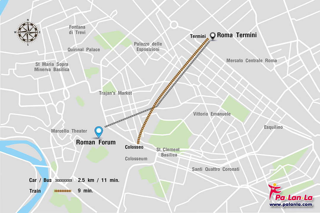 - รถยนต์ (Car) การเดินทางโดยรถยนต์จากสถานี Roma Termini ไปยัง Roman Forum โดยใช้เส้นทางสาย Via Nazionale มีระยะทาง 2.5 กิโลเมตร ใช้เวลาเดินทางประมาณ 11 นาที