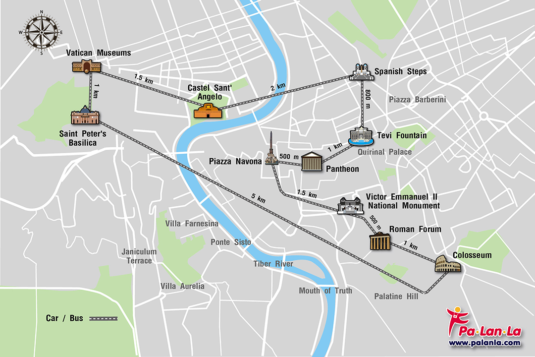 แผนที่แสดงตำแหน่ง 10 สถานที่เที่ยวยอดนิยมในกรุงโรม ประเทศอิตาลี