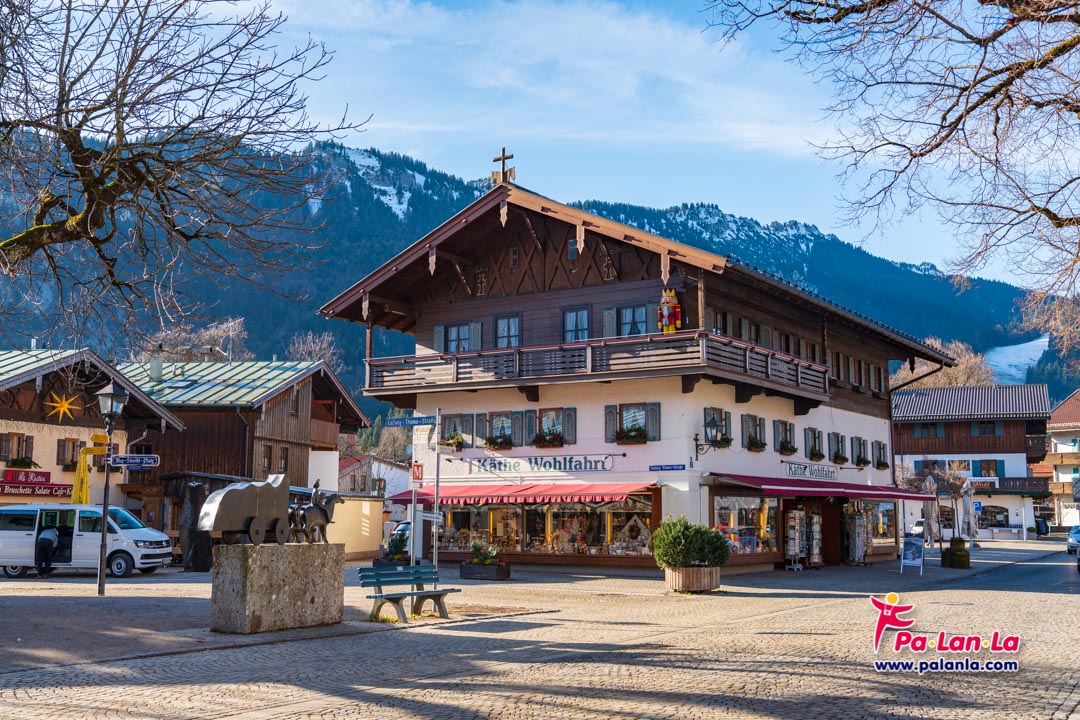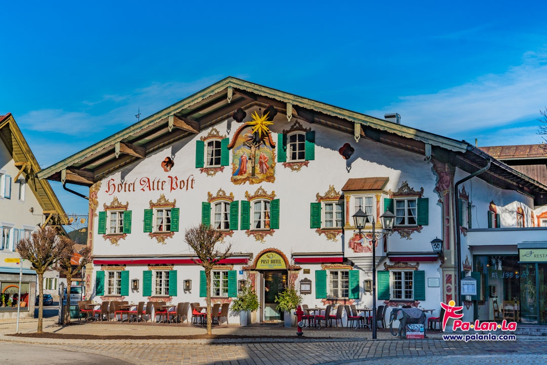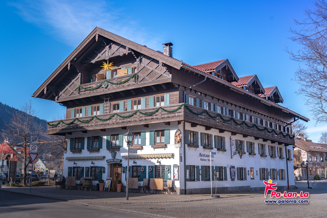 อาคารโรงแรมที่ตกแต่งด้วยภาพเขียนและศิลปะการแกะสลักไม้ภายในบริเวณหมู่บ้านโอเบอแรมเมอร์เกา