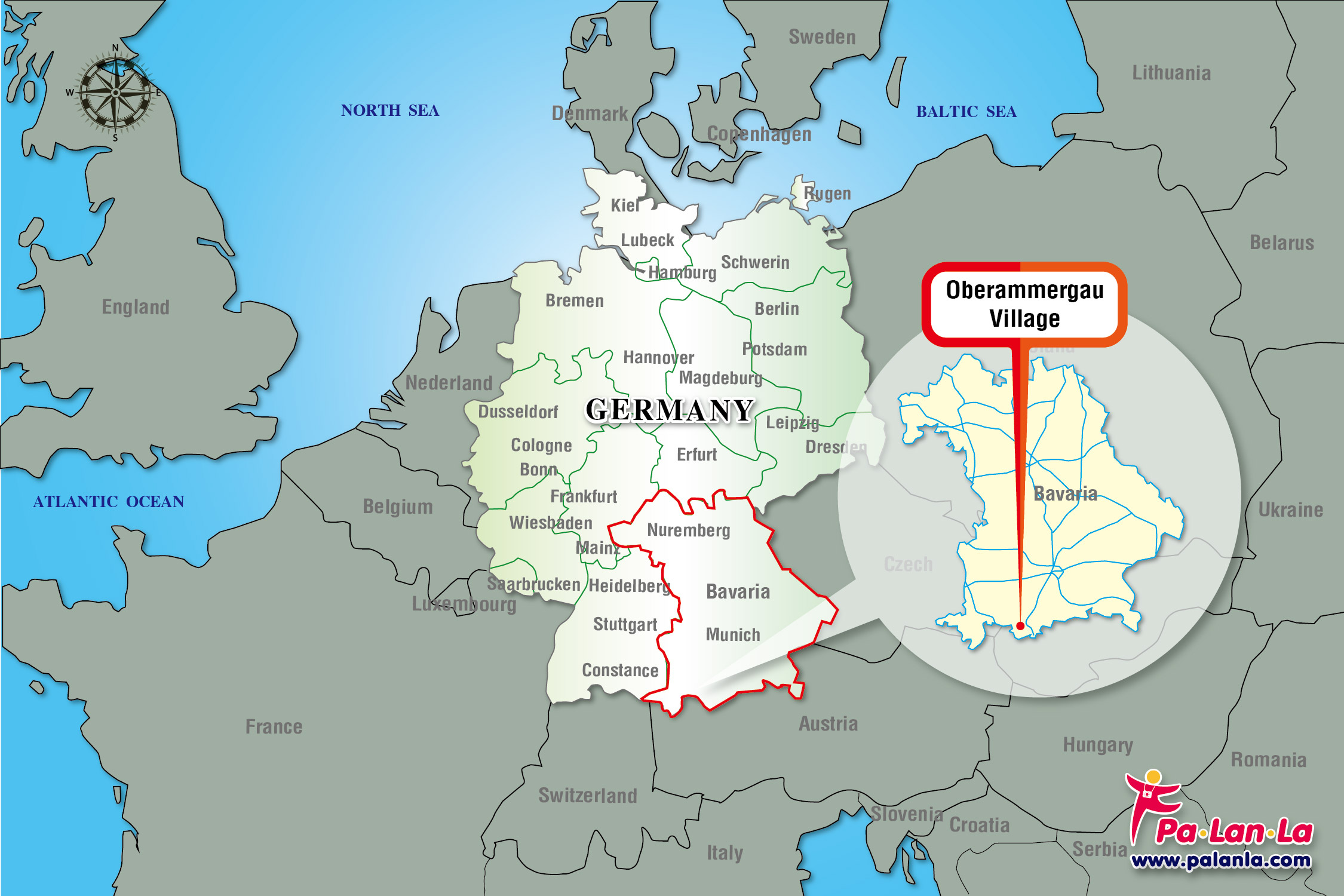 แผนที่ตั้งหมู่บ้านโอเบอแรมเมอร์เกา (Oberammergau Village) เมืองมิวนิค ประเทศเยอรมนี
