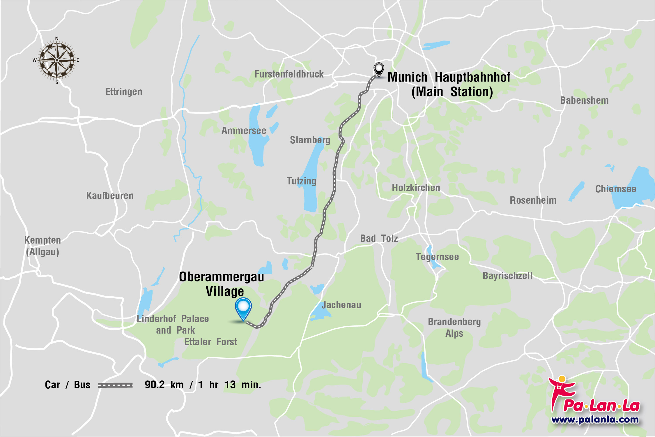 - รถยนต์ (Car) จาก Munich Hauptbahnhof (Main Station) ไปยัง Oberammergau Village มีระยะทางประมาณ 90.2 กิโลเมตร ใช้เวลาเดินทางประมาณ 1 ชั่วโมง 13 นาที