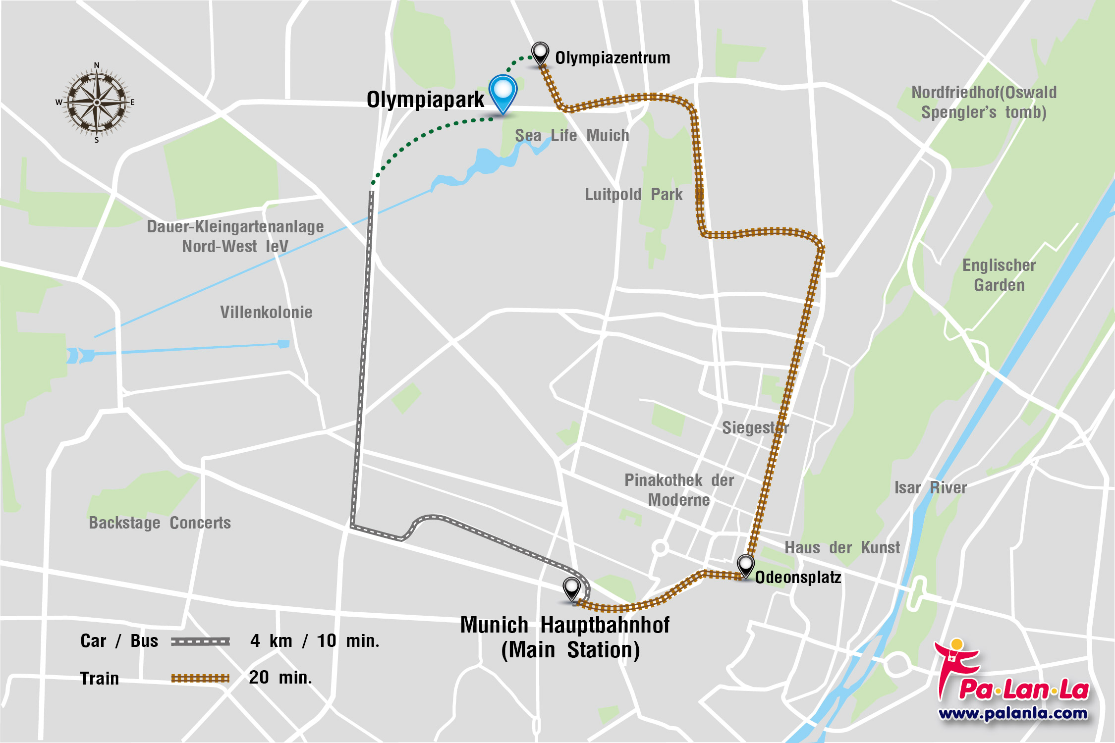 - รถยนต์ (Car) จาก Munich Hauptbahnhof (Main Station) ไปยัง Olympiapark มีระยะทางประมาณ 4 กิโลเมตร ใช้เวลาเดินทางประมาณ 10 นาที