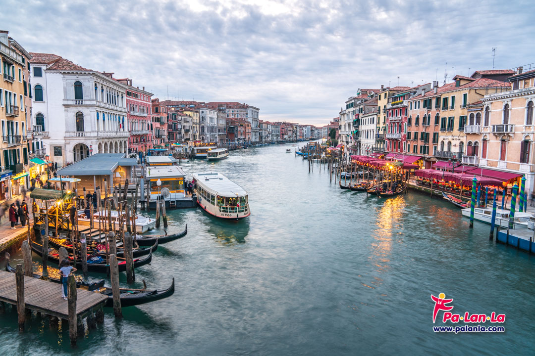บรรยากาศคลองแกรนด์คาแนล ขณะที่ Water-bus กำลังจอดเทียบท่าที่สถานีริอัลโต้ และเรือกอนโดล่าที่จอดเรียงรายอยู่ริมสองฝั่งคลอง