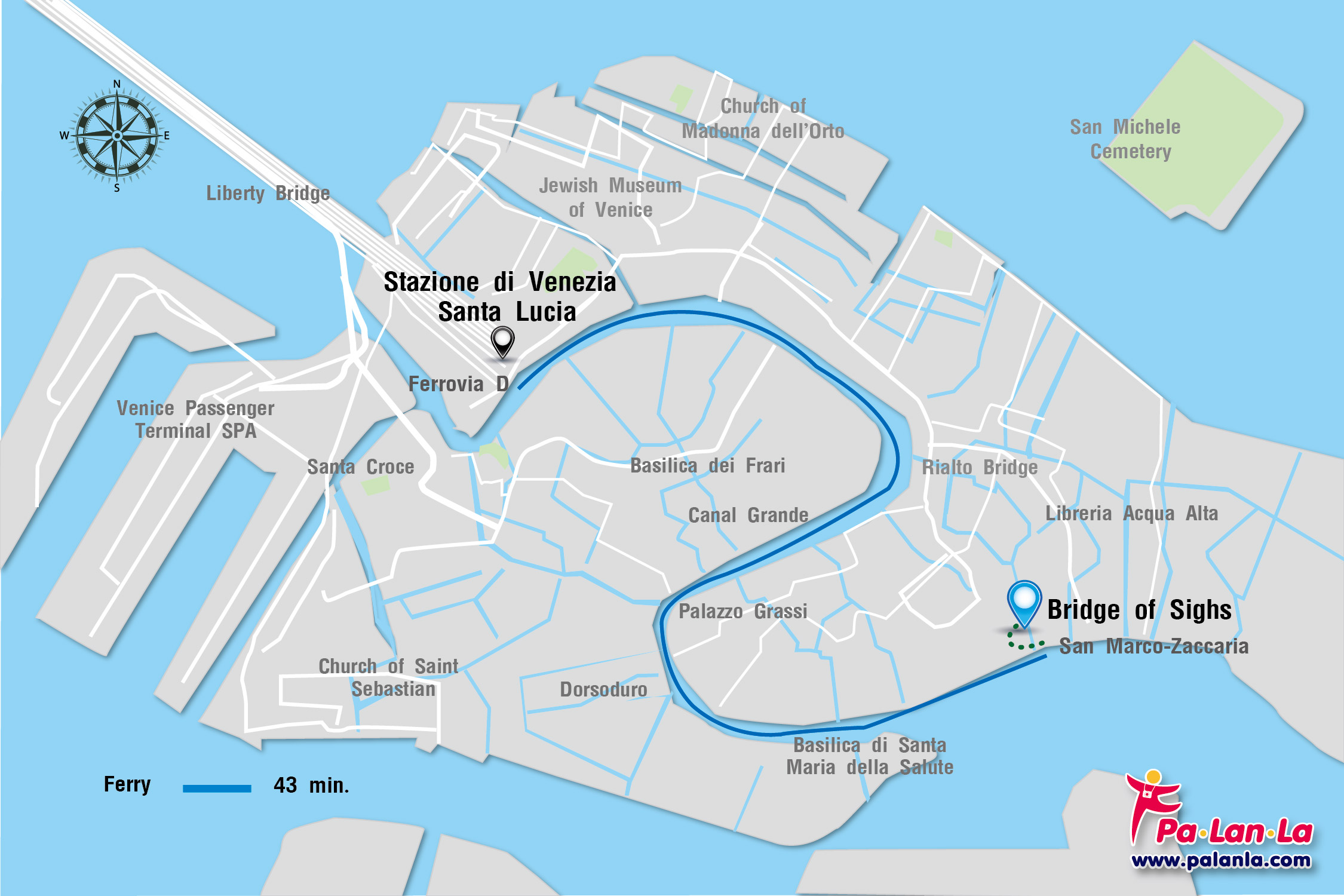 - เรือ (Ferry) จาก Stazione di Venezia Santa Lucia เดินไปยังท่าเรือ Ferrovia D เพื่อขึ้น Water-bus สาย 1 จากนั้นลงที่ท่าเรือ San Marco-Zaccaria และเดินต่อไปอีกประมาณ 200 เมตร ก็จะถึงยัง Bridge of Sighs ใช้เวลาเดินทางโดยรวมประมาณ 43 นาที