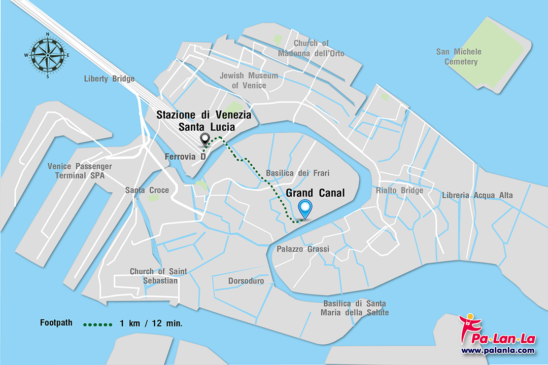 หมายเหตุ : Stazione di Venezia Santa Lucia เป็นสถานีรถไฟหลักของเมืองเวนิสที่มีเส้นทางเดินรถเชื่อมต่อกับเมืองต่างๆ ในประเทศอิตาลี รวมถึงเมืองต่างๆ ในประเทศแถบยุโรป แต่ขนส่งสาธารณะหลักภายในเมืองเวนิส จะใช้การเดินทางทางน้ำโดย “เรือประจำทาง” ที่เรียกว่า “Water-bus” ซึ่งมีท่าเรือครอบคลุมทั่วเมือง โดยท่าเรือบริเวณด้านหน้า Stazione di Venezia Santa Lucia มีจำนวน 4 ท่าแยกตามเส้นทางเดินเรือ ได้แก่ Ferrovia “A”, Ferrovia “B”, Ferrovia “C” และ Ferrovia “D”