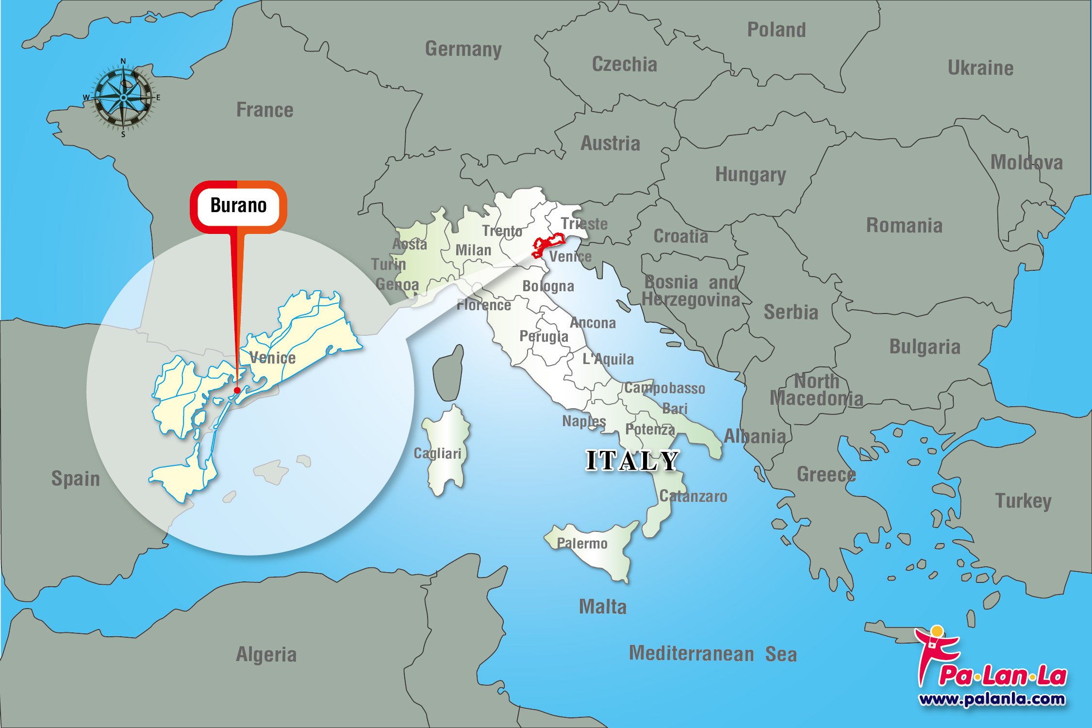 เกาะบูราโน่อยู่ห่างจากเมืองเวนิสไปทางทิศตะวันออกเฉียงเหนือประมาณ 11 กิโลเมตร มีประชากรท้องถิ่นประมาณ 3,000 คน ชื่อ “Burano” มาจากภาษาท้องถิ่นว่า “Porta Boreana” มีความหมายว่า “ประตูเมืองด้านเหนือ” เกาะแห่งนี้มีความโดดเด่นจากอาคารบ้านเรือนที่มีสีสันสดใสตัดกับสีของท้องฟ้าและท้องทะเล เกิดเป็นทัศนียภาพที่มีความสวยงามเป็นเอกลักษณ์เฉพาะตัว