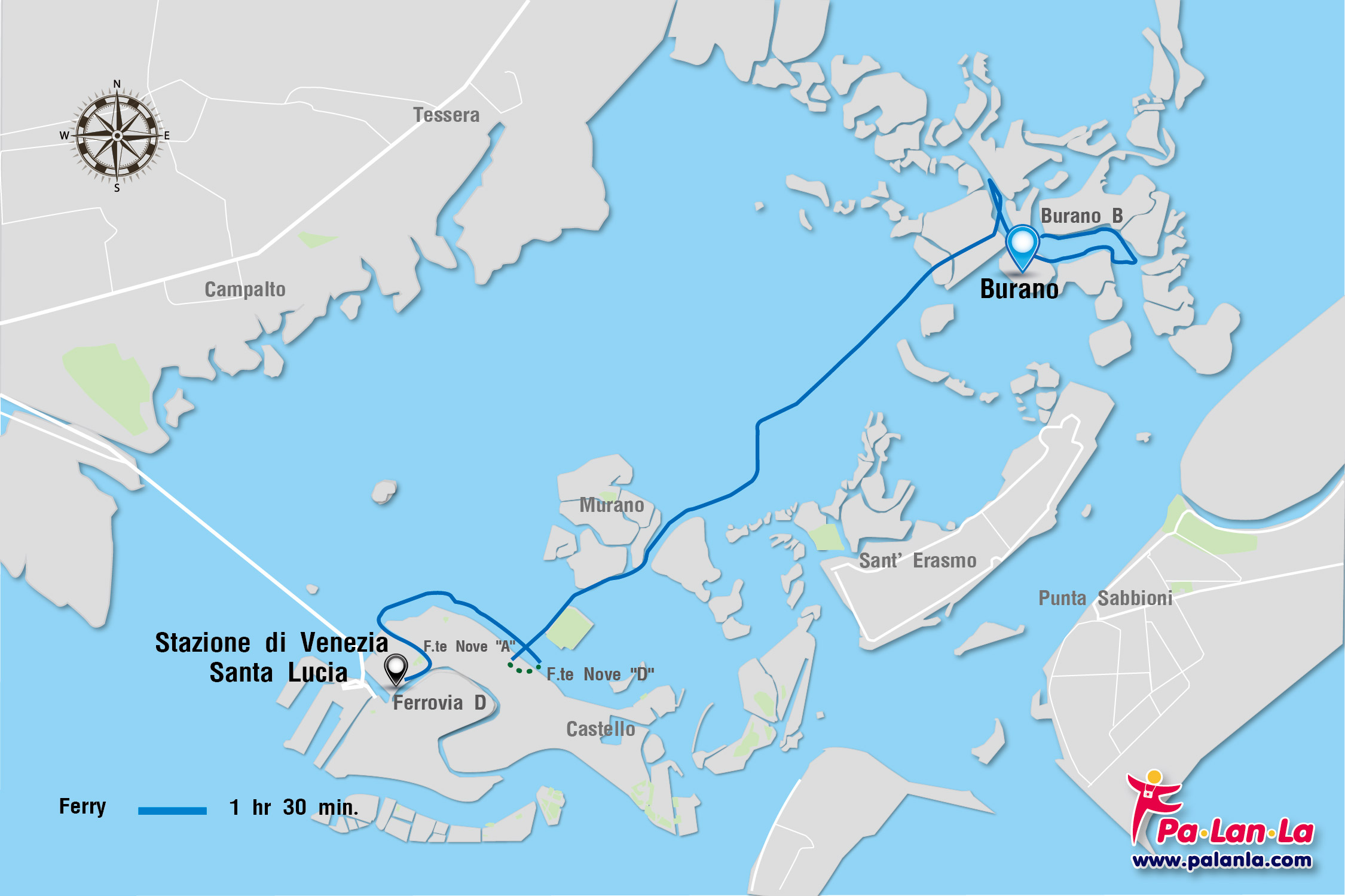 - เรือ (Ferry) จาก Stazione di Venezia Santa Lucia เดินไปยังท่าเรือ Ferrovia D เพื่อขึ้น Water-bus สาย 5.2 จากนั้นลงที่ท่า F.te Nove "D" และเดินไปต่อเรือที่ท่าเรือ F.te Nove "A" เพื่อขึ้น Water-bus สายที่ไป Burano แล้วไปลงยังท่าเรือ Burano "B" ก็จะถึงยัง Burano ใช้เวลาเดินทางโดยรวมประมาณ 1 ชั่วโมง 30 นาที