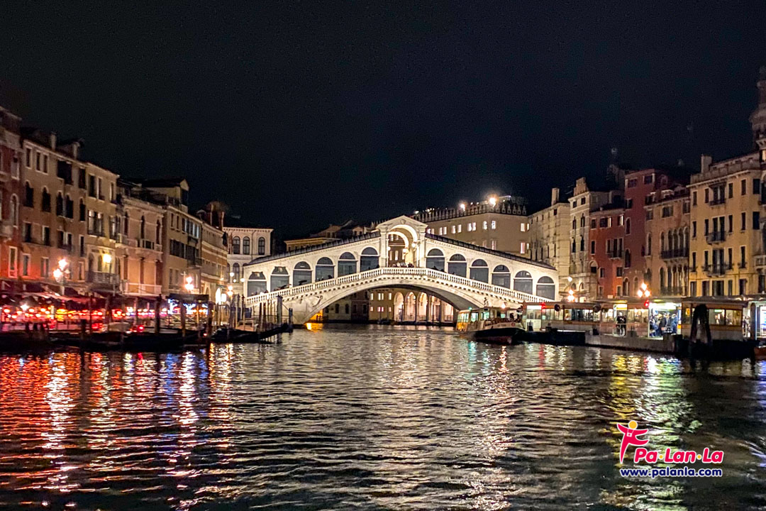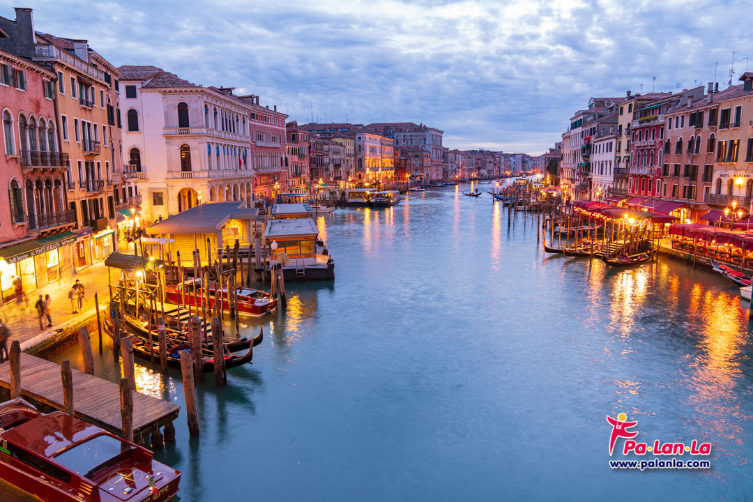 มุมถ่ายภาพนี้อยู่บริเวณด้านบนสะพานริอัลโต (Ponte di Rialto) สะพานข้ามคลองแกรนด์คาแนลในย่านการค้าที่มีความพลุกพล่านที่สุดในเมืองเวนิส โดยภาพนี้จะถ่ายในช่วงใกล้ค่ำ เมื่ออาคารบ้านเรือสองฝั่งคลองเริ่มเปิดไฟ ก็จะได้ภาพคลองแกรนด์คาแนลที่มีแสงไฟสะท้อนอยู่บนผิวน้ำ เกิดเป็นทัศนียภาพอันสวยงามของเมืองแห่งสายน้ำในยามราตรี