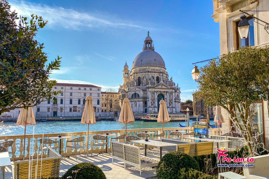 มุมถ่ายภาพนี้อยู่บริเวณระเบียงริมน้ำของโรงแรมโมนาโคแอนด์แกรนด์คาแนล (Hotel Monaco & Grand Canal) ที่ตั้งอยู่ริมคลองแกรนด์คาแนล จากมุมนี้จะได้ภาพความสวยงามของมหาวิหารซานตามารียา เดลล่า ซาลูเต (Basilica di Santa Maria della Salute) ที่ตั้งอยู่ในฝั่งตรงกันข้ามกับโรงแรม