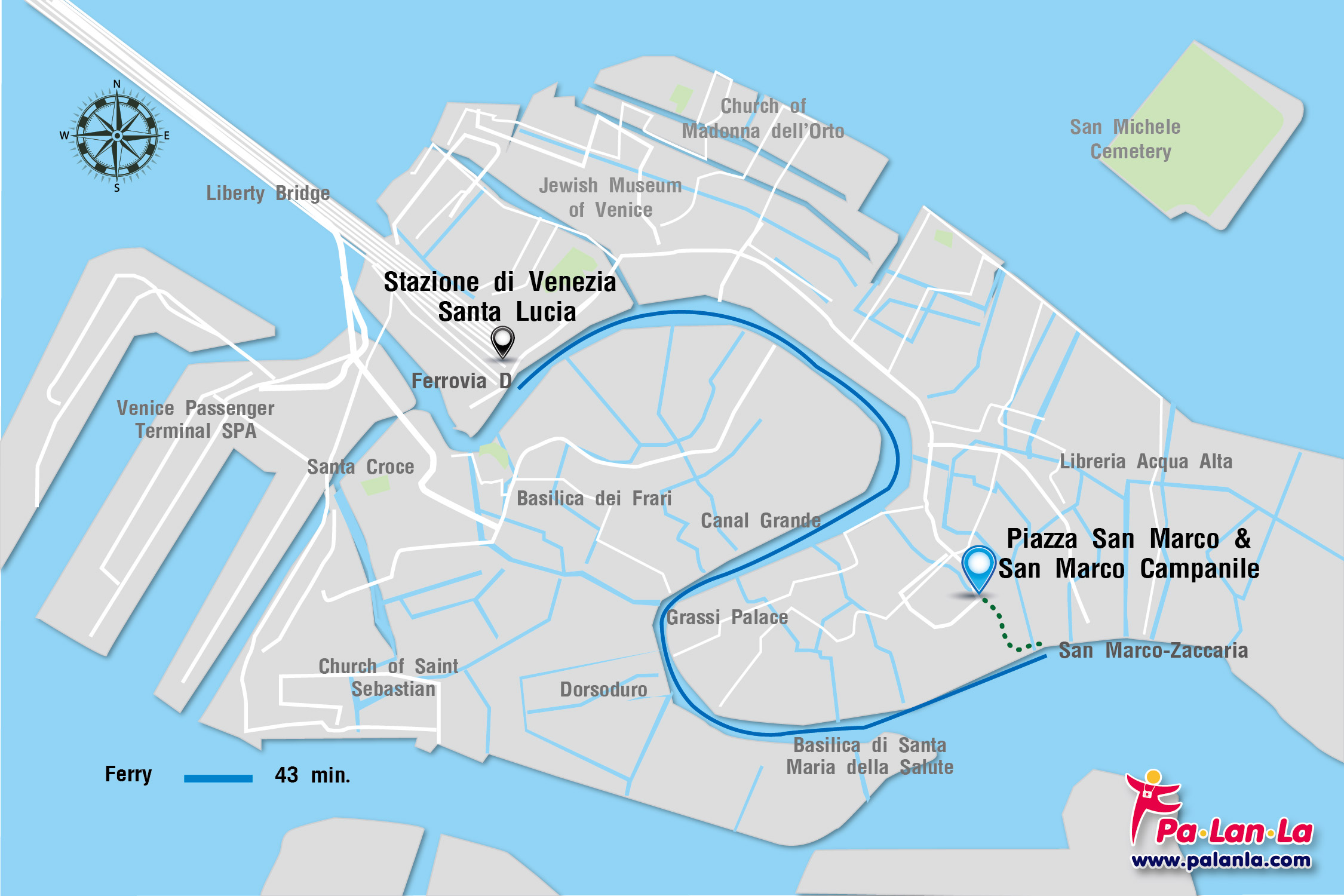 - เรือ (Ferry) จาก Stazione di Venezia Santa Lucia เดินไปยังท่าเรือ Ferrovia D เพื่อขึ้น Water-bus สาย 1 จากนั้นลงที่ท่าเรือ San Marco Zaccaria และเดินต่อไปอีกประมาณ 200 เมตร ก็จะถึงยัง Piazza San Marco & San Marco Campanile ใช้เวลาเดินทางโดยรวมประมาณ 43 นาที