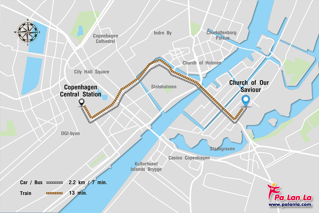 - รถไฟ (Train) จากสถานี Copenhagen Central Station ไปยัง Church of Our Saviour นักท่องเที่ยวสามารถนั่งไฟสาย 2 A ไปลงที่สถานี Christianshavn St ใช้เวลาประมาณ 13 นาที