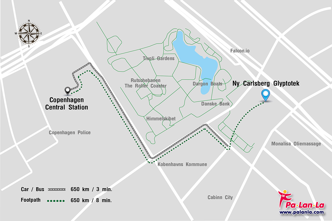 - เดิน (Footpath) จากสถานี Copenhagen Central Station นักท่องเที่ยวสามารถไปยัง Ny Carlsberg Glyptotek ได้โดยเดินไปตามถนน Tietgensgade ใช้เวลาประมาณ 8 นาที