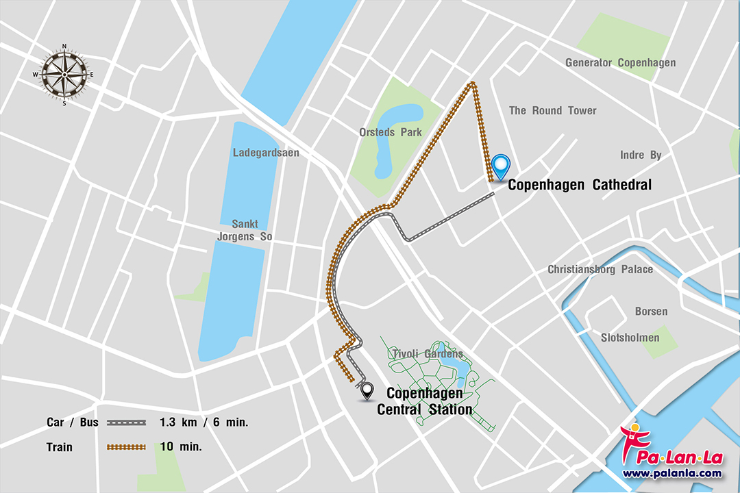 - รถยนต์ (Car) การเดินทางโดยรถยนต์จากสถานี Copenhagen Central Station ไปยัง Copenhagen Cathedral (Church of Our Lady) โดยใช้เส้นทางสาย Hammerichsgade มีระยะทาง 1.3 กิโลเมตร ใช้เวลาเดินทางประมาณ 6 นาที