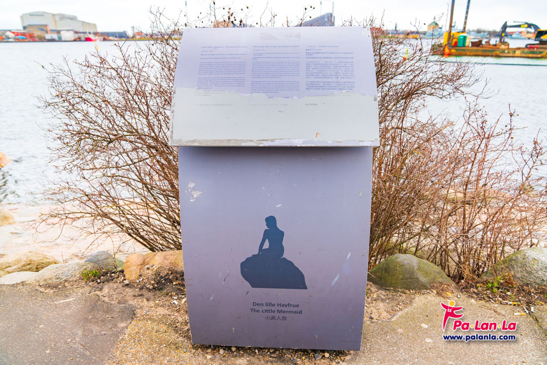 แท่นแสดงประวัติของรูปปั้น ลิตเทิลเมอร์เมดริมลิตเทิลเมอร์เมดที่ตั้งอยู่ทางเดินริมน้ำ Langelinie