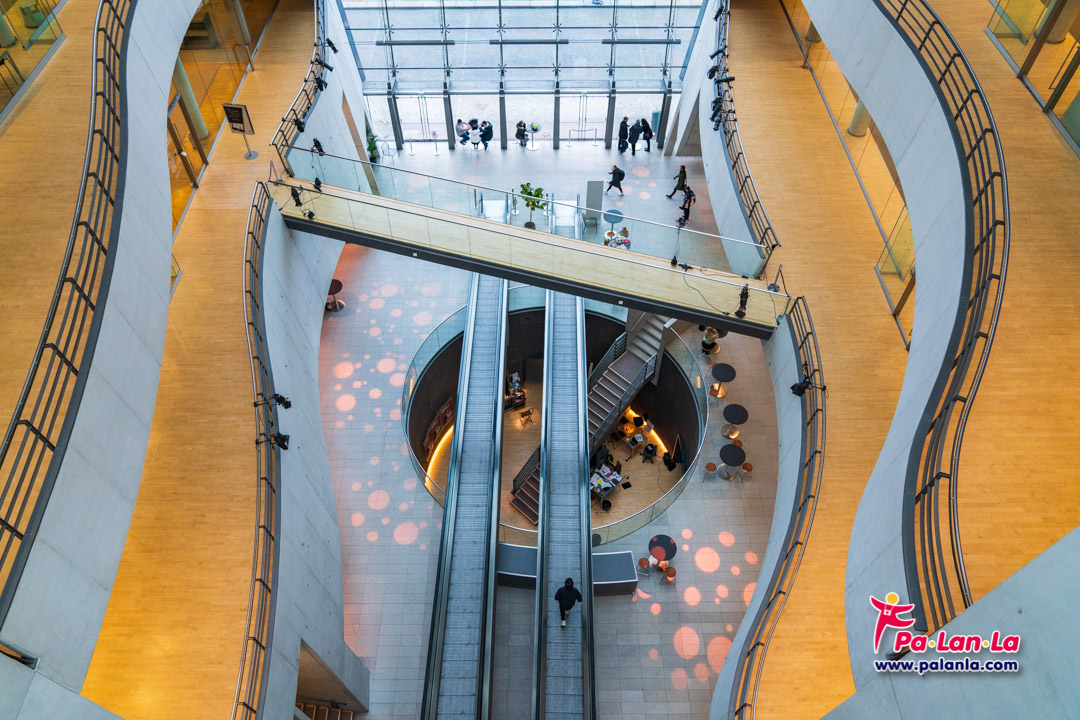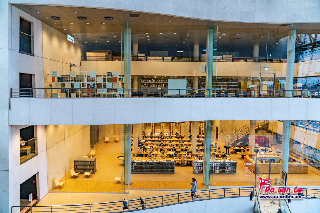 อาคารหอสมุดมีทั้งหมด 7 ชั้นด้วยกัน ภายในไม่เพียงแต่เป็นที่อ่านหนังสือดั้งเดิมเท่านั้น แต่ยังประกอบไปด้วยส่วนต่างๆ ที่น่าสนใจอีกหลายส่วน ทั้งห้องอ่านหนังสือที่สร้างขึ้นมาใหม่อีก 4 ห้อง คอนเสิร์ตฮอลล์ ห้องจัดแสดงนิทรรศการ ร้านหนังสือ คาเฟ่ และภัตตาคารด้วย