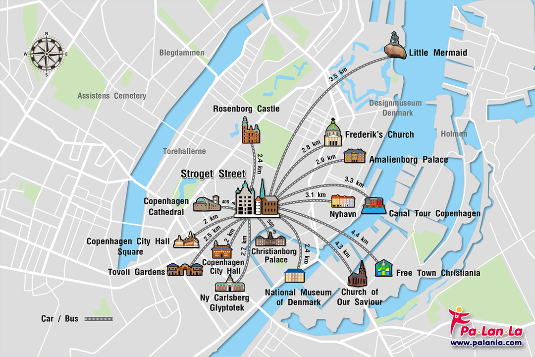 - รถยนต์ (Car) การเดินทางโดยรถยนต์จากสถานี Copenhagen Central Station ไป Stroget Street โดยใช้เส้นทางสาย Hammerichsgade มีระยะทาง 2 กิโลเมตร ใช้เวลาเดินทางประมาณ 8 นาที