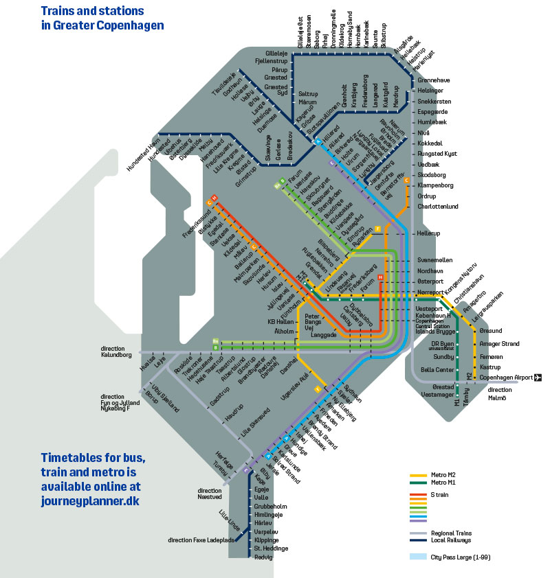 แผนที่แสดงระบบขนส่งสาธารณะเมืองโคเปนเฮเกน ขอบคุณภาพประกอบจาก http://www.peregene.com/public-transportation-in-copenhagen/