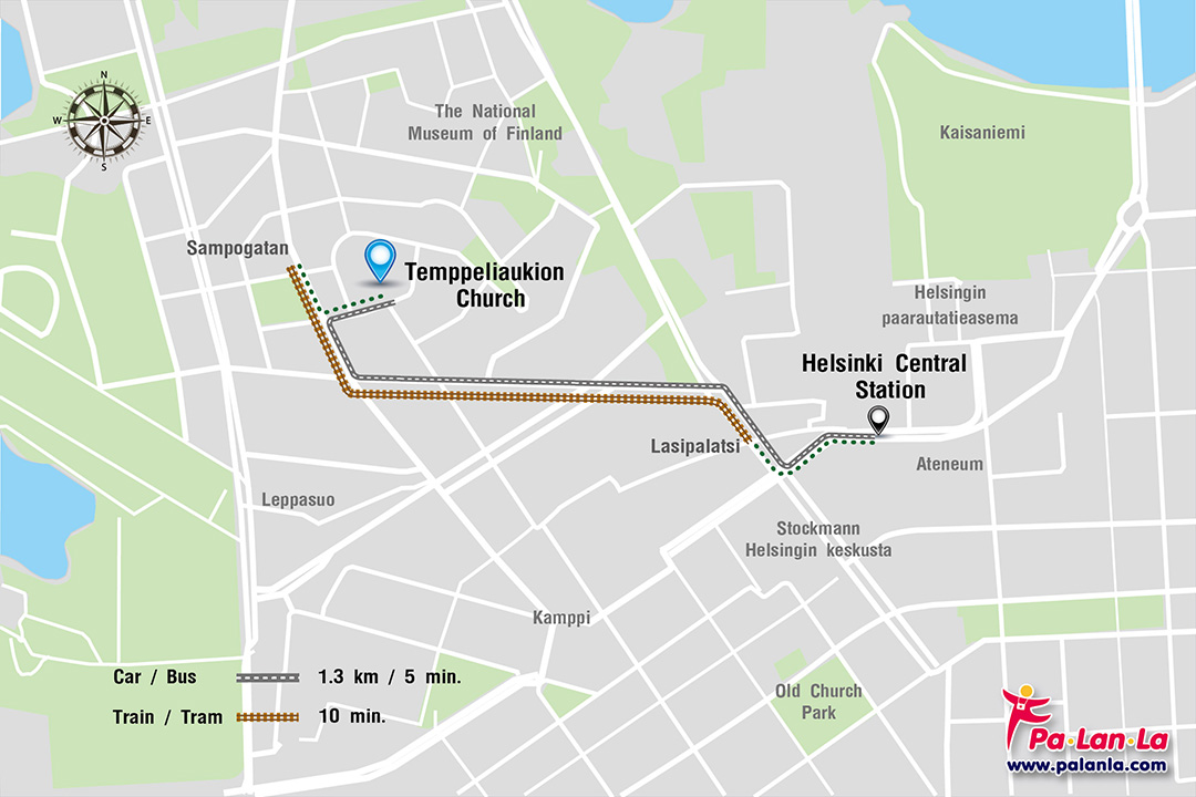 - รถยนต์ (Car) การเดินทางโดยรถยนต์จาก Helsinki Central Station ไปยัง Temppeliaukio Church โดยใช้ถนนสาย Arkadiagatan/Arkadiankatu มีระยะทาง 1.3 กิโลเมตร ใช้เวลาประมาณ 5 นาที