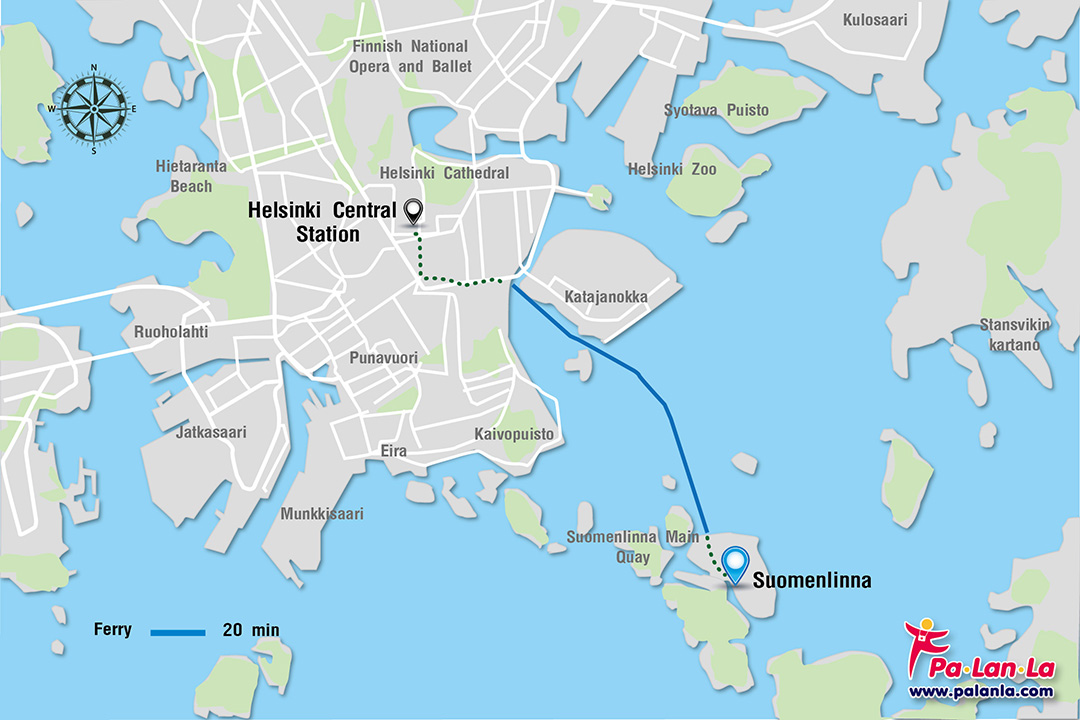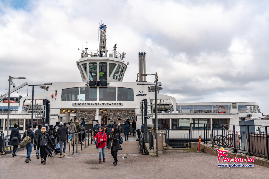 - เรือเฟอร์รี่ (Ferry) จากสถานีรถไฟกลางเฮลซิงกิ (Helsinki Central Station) นักท่องเที่ยวจะต้องเดิน (ประมาณ 800 เมตร) ไปขึ้นเรือเฟอร์รี่สาย Kauppatori - Suomenlinna/Salutorget – Sveaborg ที่ท่าเรือ Salutorget นั่งไปลงที่ท่าเรือ Suomenlinna, Main Quay ใช้เวลาเดินทางประมาณ 20 นาที ค่าโดยสารเรือ 2.8 ยูโร สามารถซื้อตั๋วได้จากตู้ที่อยู่ด้านหน้าท่าเรือได้เลย