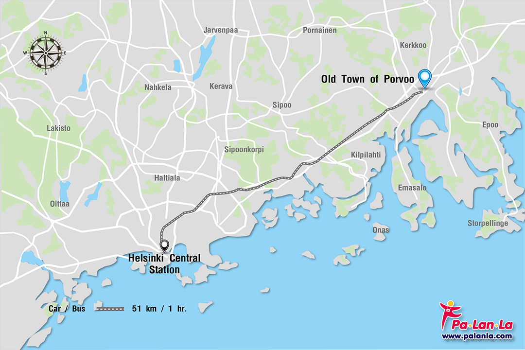 - รถประจำทาง (Bus) การเดินทางโดยรถประจำทางจาก Helsinki Central Station ไปยัง Old Town of Porvoo สามารถนั่งรถประจำทางสาย 848 ไปลงที่ป้าย Näsebackavägen ซึ่งอยู่ห่างจากใจกลาง Old Town of Porvoo 500 เมตร ใช้เวลาเดินทางโดยรวม 1 ชั่วโมง 10 นาที