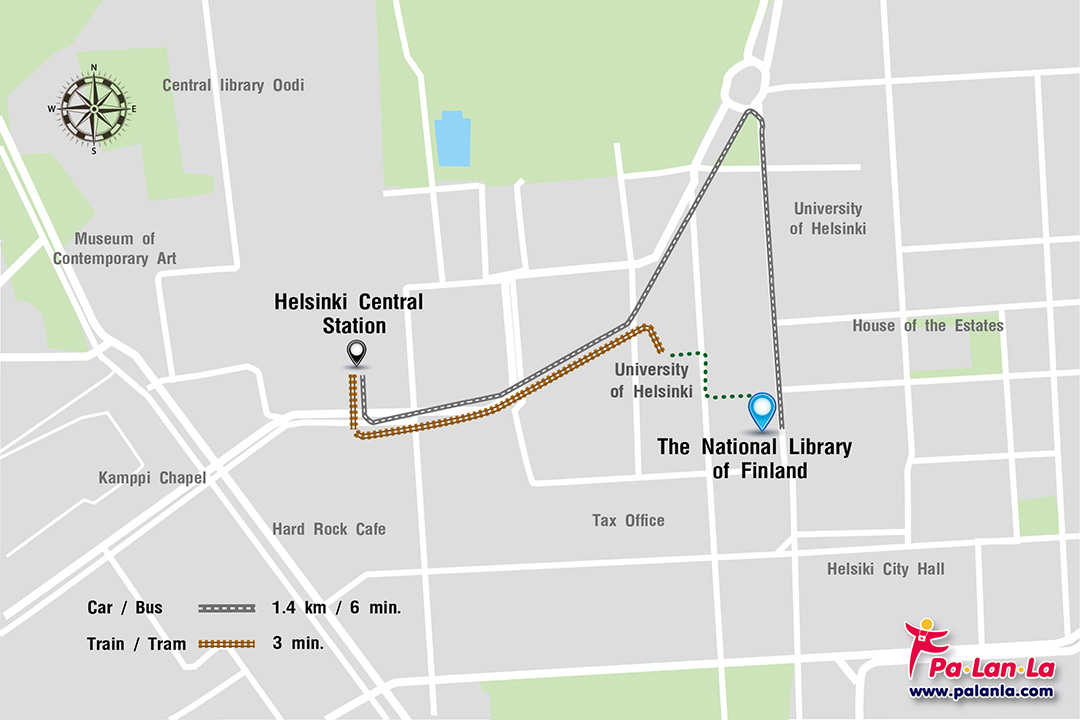 - รถยนต์ (Car) การเดินทางโดยรถยนต์จาก Helsinki Central Station ไปยัง National Library of Finland โดยใช้ถนนสาย Kaisaniemenkatu/Kajsaniemigatan และ Unioninkatu/Unionsgatan มีระยะทาง 1.4 กิโลเมตร ใช้เวลาประมาณ 6 นาที