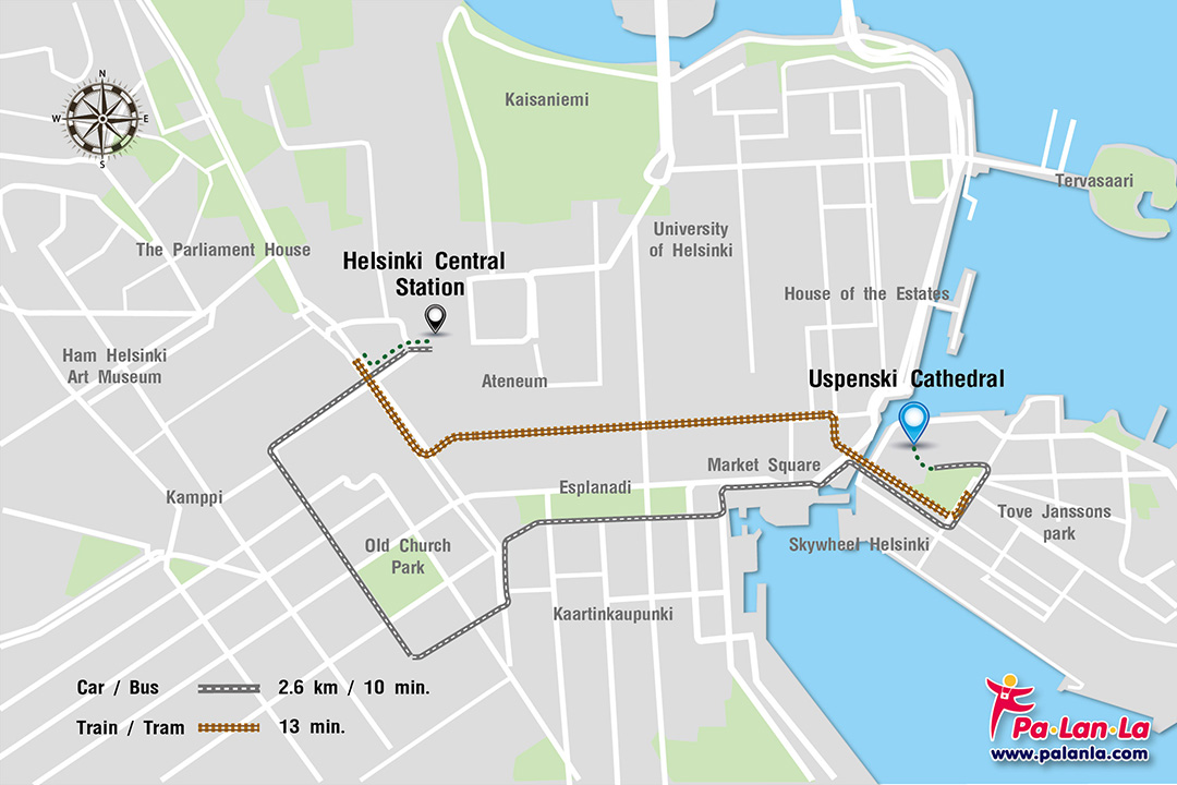- รถยนต์ (Car) การเดินทางโดยรถยนต์จาก Helsinki Central Station ไปยัง Upenski Cathedral โดยใช้ถนนสาย Annankatu/Annegatan มีระยะทาง 2.6 กิโลเมตร ใช้เวลาประมาณ 10 นาที