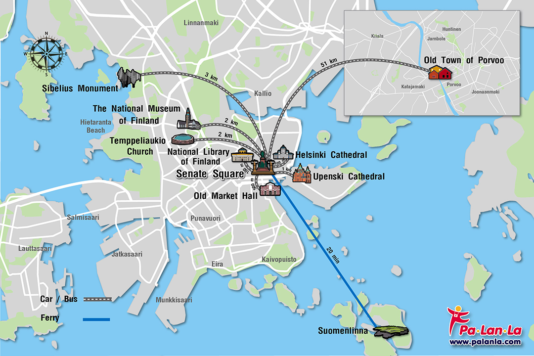 แผนที่แสดงตำแหน่งสถานที่ท่องเที่ยวยอดนิยมในเฮลซิงกิทั้ง 10 แห่ง