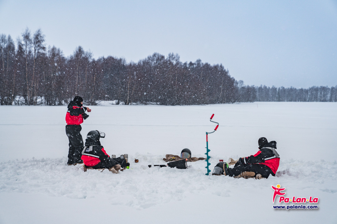 การตกปลาน้ำแข็ง (Ice Fishing) สต้าฟจะเลือกจุดที่เหมาะสมสำหรับการตกปลา และสอนวิธีการตกปลาน้ำแข็งแก่ลูกทัวร์แก่ลูกทัวร์ก่อน วิธีตกปลาน้ำแข็งคือสต้าฟจะใช้เครื่องเจาะน้ำแข็งที่มีลักษณะคล้ายกับเกลียวสว่านเจาะลงไปให้ลึกจนถึงระดับที่เป็นน้ำ เมื่อเจาะลงไปแล้วมองเห็นสายน้ำไหลอยู่ข้างล่างจากนั้นค่อยเอาเบ็ดหย่อนลงไปในรูและรอให้ปลามากินเหยื่อ โดยช่วงเวลาที่เหมาะและปลอดภัยสำหรับการตกปลามากที่สุดคือช่วงที่อากาศติดลบต่อเนื่องเป็นเวลานาน จนทะเลสาบกลายเป็นน้ำแข็งและมั่นใจได้ว่าน้ำแข็งจะไม่ยุบตัว ซึ่งก็คือตั้งแต่ช่วงเดือนธันวาคมไปจนถึงเดือนเมษายน ซึ่งช่วงดังกล่าวนี้เป็นช่วงที่กลางวันเริ่มยาวขึ้นและแสงแดดเริ่มส่องมากขึ้นด้วยนั่นเอง ไม่ว่าจะออกไปตกปลาน้ำแข็งที่ไหนก็ตาม สิ่งที่ต้องคำนึงถึงคือความแข็งของน้ำ เนื่องจากความแข็งหรือเปราะบางของน้ำแข็งนั้นขึ้นอยู่กับเงื่อนไขของสภาพอากาศ ดังนั้นสต้าฟผู้เชี่ยวชาญในการเลือกโลเกชั่นสำหรับการตกปลาจึงมีความสำคัญอย่างยิ่ง โดยสถานที่ที่จะตกปลาน้ำแข็งนั้นจะต้องมีความหนาอย่างน้อย 5 เซนติเมตร