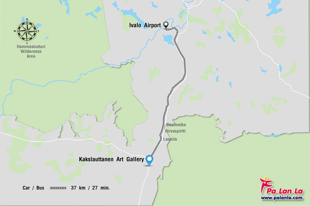 Kakslauttanen Arctic Art Gallery เป็นส่วนหนึ่งของ Kakslauttanen Arctic Resort สนามบินที่อยู่ใกล้กับ Kakslauttanen Arctic Resort มากที่สุดคือสนามบิน Ivalo (IVL) เมืองอิวาโล (Ivalo) ซึ่งเป็นส่วนหนึ่งของภูมิภาคแลปแลนด์ (Lapland) โดยตั้งอยู่ทางตอนเหนือสุดของประเทศฟินแลนด์ ห่างจากเมืองหลวงคือเฮลซิงกิ (Helsinki) ราว 1,094 กิโลเมตร จากประเทศไทยไม่มีเที่ยวบินตรง นักท่องเที่ยวที่ต้องการเดินทางไปยังเมืองอิวาโลจะต้องต่อเครื่องไปจากเฮลซิงกิ ส่วนการเดินทางโดยรถยนต์นั้นใช้เวลาที่ยาวนาน