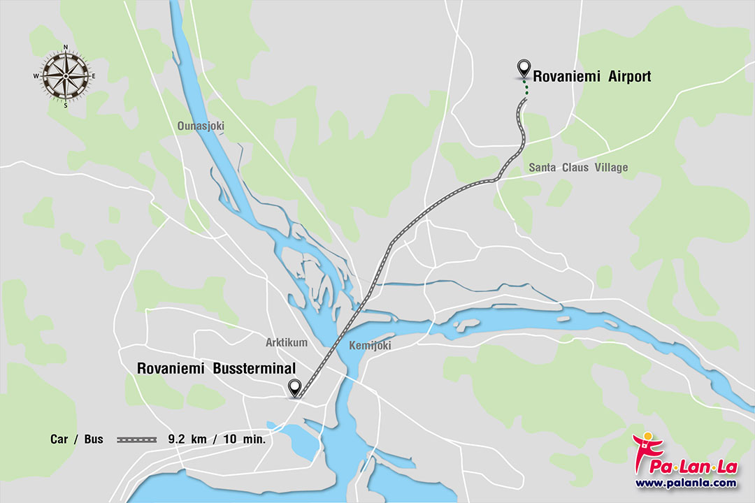 - รถยนต์ (Car) การเดินทางโดยรถยนต์จากสนามบินโรวาเนียมี (Rovaniemi Airport) เข้าเมืองโดยปักหมุดที่สถานีขนส่งโรวาเนียมี (Rovaniemi Bussterminal) ซึ่งเป็นศูนย์กลางการเดินทางโดยระบบขนส่งสาธารณะ มีระยะทาง 9.2 กิโลเมตร ใช้เวลาเดินทาง 10 นาที