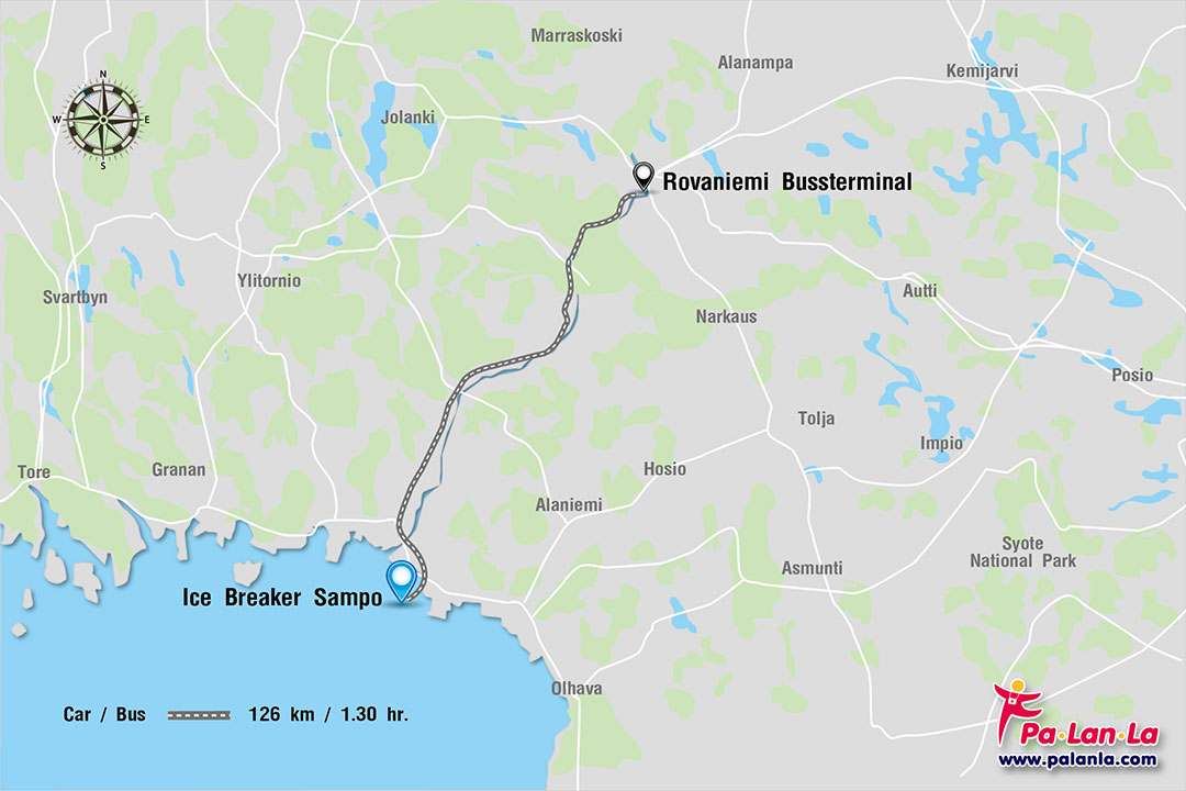 - รถยนต์ (Car) การเดินทางโดยรถยนต์จากสถานีขนส่งโรวาเนียมี (Rovaniemi Bussterminal) ไป Ice Breaker Sampo เมืองเคมิ โดยใช้ถนนสาย E75 มีระยะทาง 126 กิโลเมตร ใช้เวลาเดินทาง 1 ชั่วโมง 30 นาที