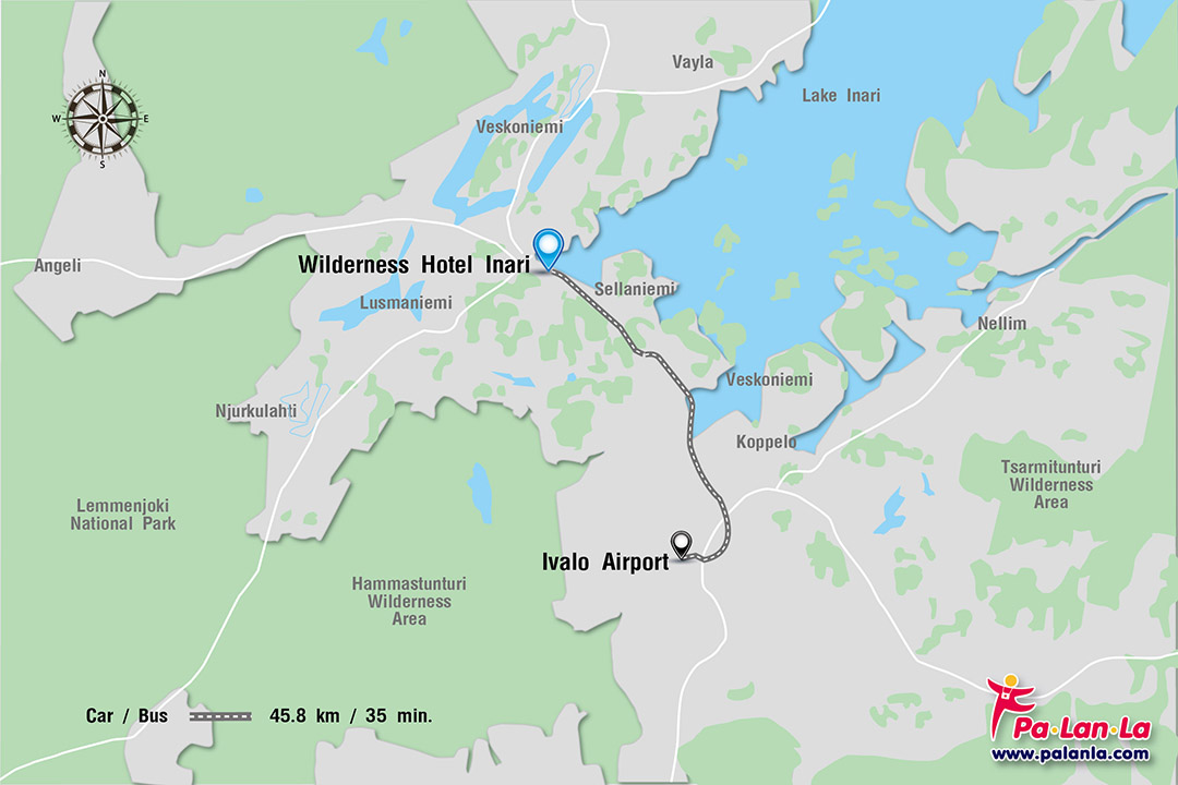 สนามบินที่อยู่ใกล้กับ Wilderness Hotel Inari มากที่สุดคือสนามบิน Ivalo (IVL) เมืองอิวาโล (Ivalo) ซึ่งเป็นส่วนหนึ่งของภูมิภาคแลปแลนด์ (Lapland) โดยตั้งอยู่ทางตอนเหนือสุดของประเทศฟินแลนด์ ห่างจากเมืองหลวงคือเฮลซิงกิ (Helsinki) ราว 1,094 กิโลเมตร จากประเทศไทยไม่มีเที่ยวบินตรง นักท่องเที่ยวที่ต้องการเดินทางไปยังเมืองอิวาโลจะต้องต่อเครื่องไปจากเฮลซิงกิ ส่วนการเดินทางโดยรถยนต์นั้นใช้เวลาที่ยาวนาน