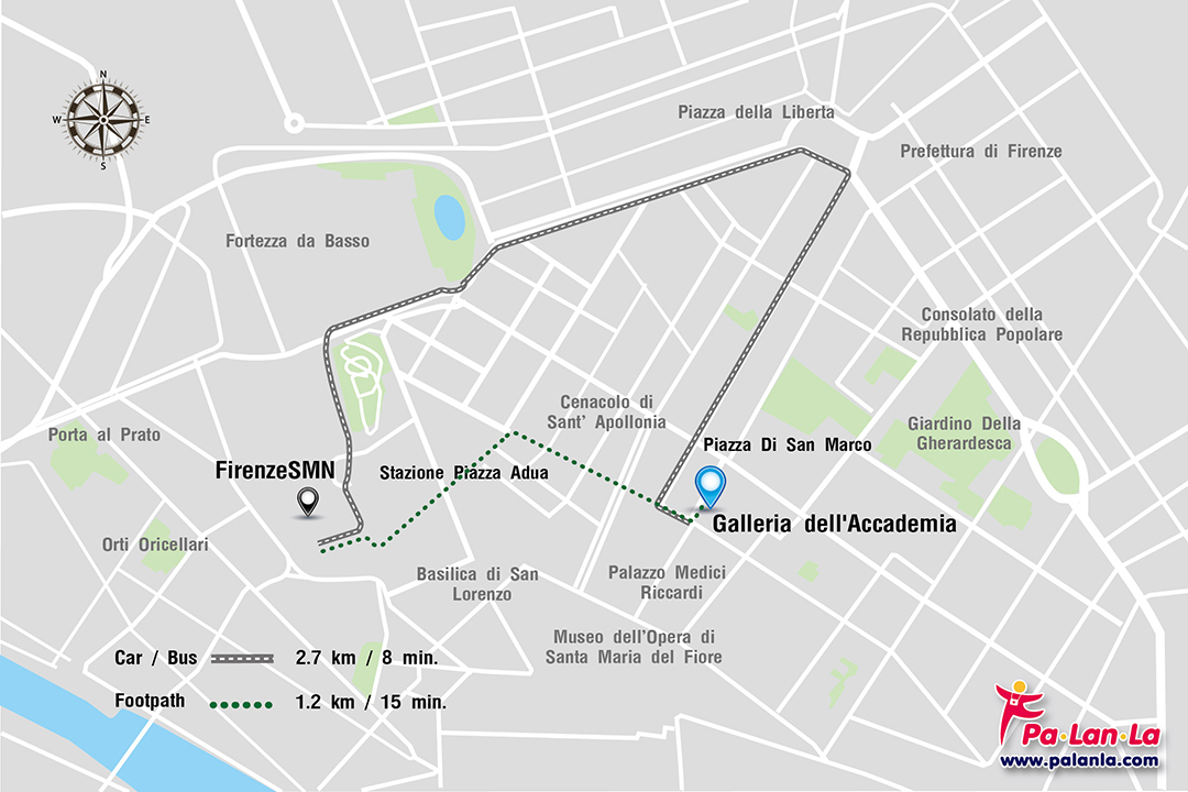 - การเดิน (Footpath) จากสถานีรถไฟกลาง Firenze S.M.N.ไปยัง Galleria dell' Accademia ระยะทางประมาณ 1.2 กิโลเมตร ใช้เวลาประมาณ 15 นาที