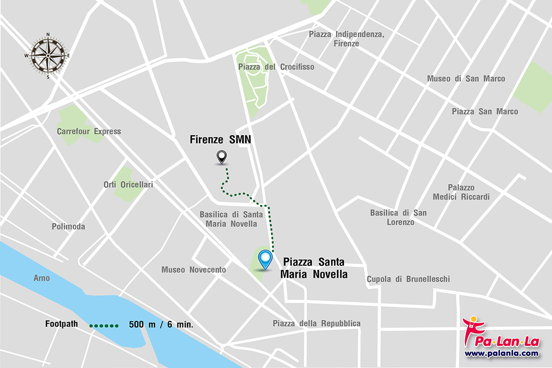 - การเดิน (Footpath) จากสถานีรถไฟกลาง Firenze S.M.N. ไปยังจัตุรัส Piazza di Santa Maria Novella ระยะทางประมาณ 500 เมตร ใช้เวลาประมาณ 6 นาที