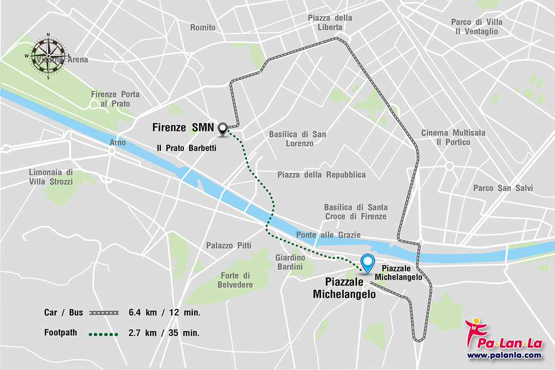 - การเดิน (Footpath) จากสถานีรถไฟกลาง Firenze S.M.N. ไปยัง Piazzale Michelangeloระยะทางประมาณ 2.7 กิโลเมตร ใช้เวลาประมาณ 35 นาที