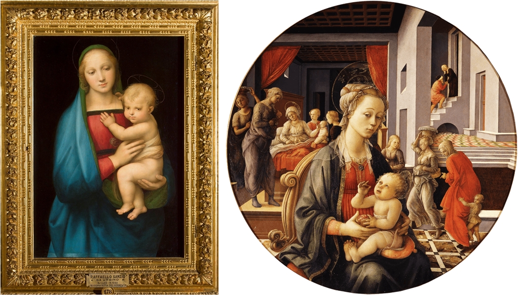 Madonna del Granduca ผลงานของ Raphael Sanzio (ซ้าย) Madonna with the Child ผลงานของTitian (ขวา) ขอบคุณภาพจาก https://www.uffizi.it/