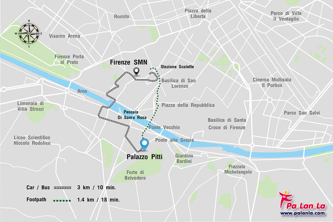 - การเดิน (Footpath) จากสถานีรถไฟกลาง Firenze S.M.N.ไปยังพระราชวัง Palazzo Pittiระยะทางประมาณ 1.4 กิโลเมตร ใช้เวลาประมาณ 18 นาที