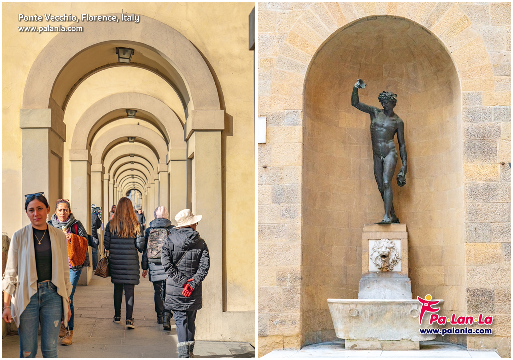ทางเดินด้านข้างสะพานเวคคิโอ และประติมากรรมบริเวณร้านค้า
