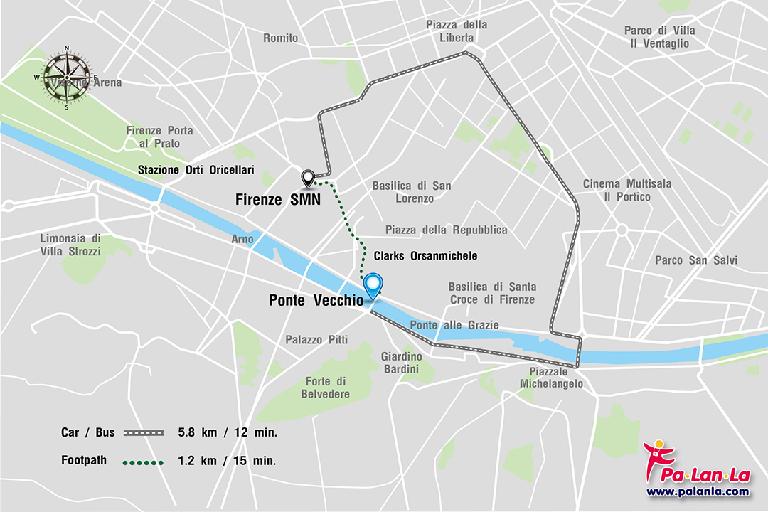 - การเดิน (Footpath) จากสถานีรถไฟกลาง Firenze S.M.N. ไปยังสะพาน Vecchio ระยะทางประมาณ 1.2 กิโลเมตร ใช้เวลาประมาณ 15 นาที